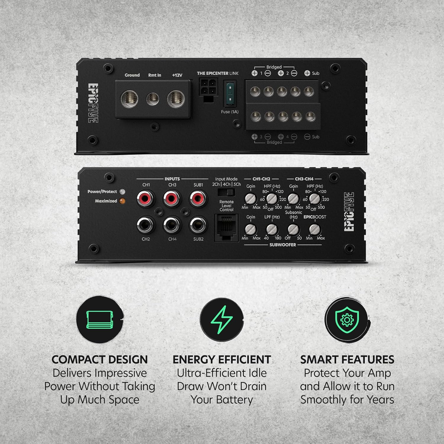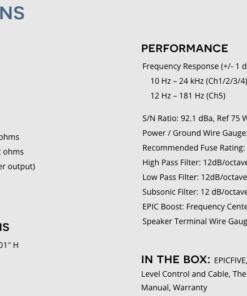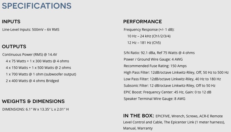 AudioControl EPICFIVE Epic Series 1100 Watt RMS 5-Channel Car Audio Amplifier, Class D, Epic Boost, Subsonic Filter, High-Pass/Low-Pass Filters, ACR-E Remote Bass Knob, Epicenter Link