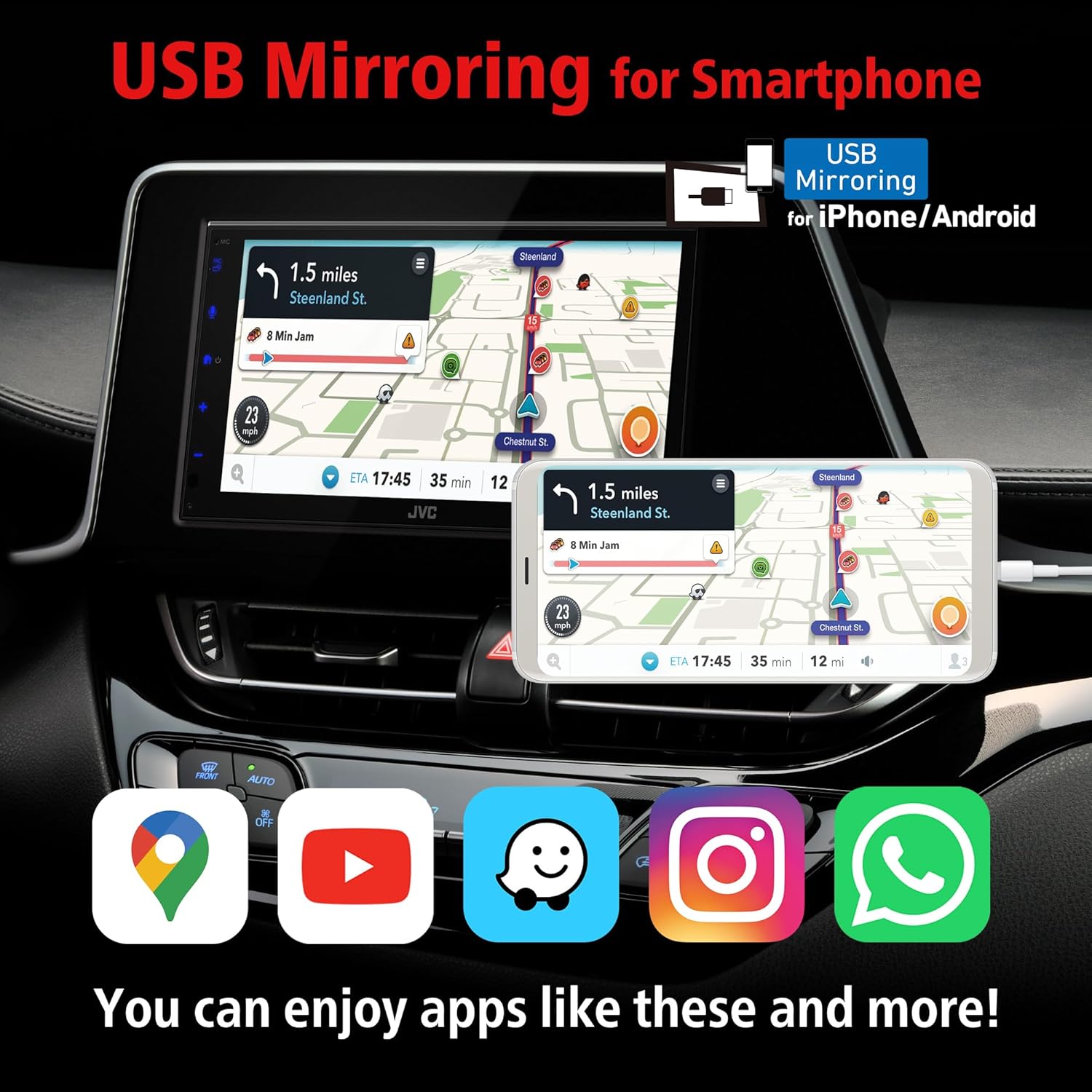 By installing the “Mirroring OA for JVC” app, your Android phone is seamlessly displayed on the receiver's screen via USB. You can enjoy a variety of apps such as Waze, YouTube, and Instagram. Touch control is possible from both screen and smartphone.