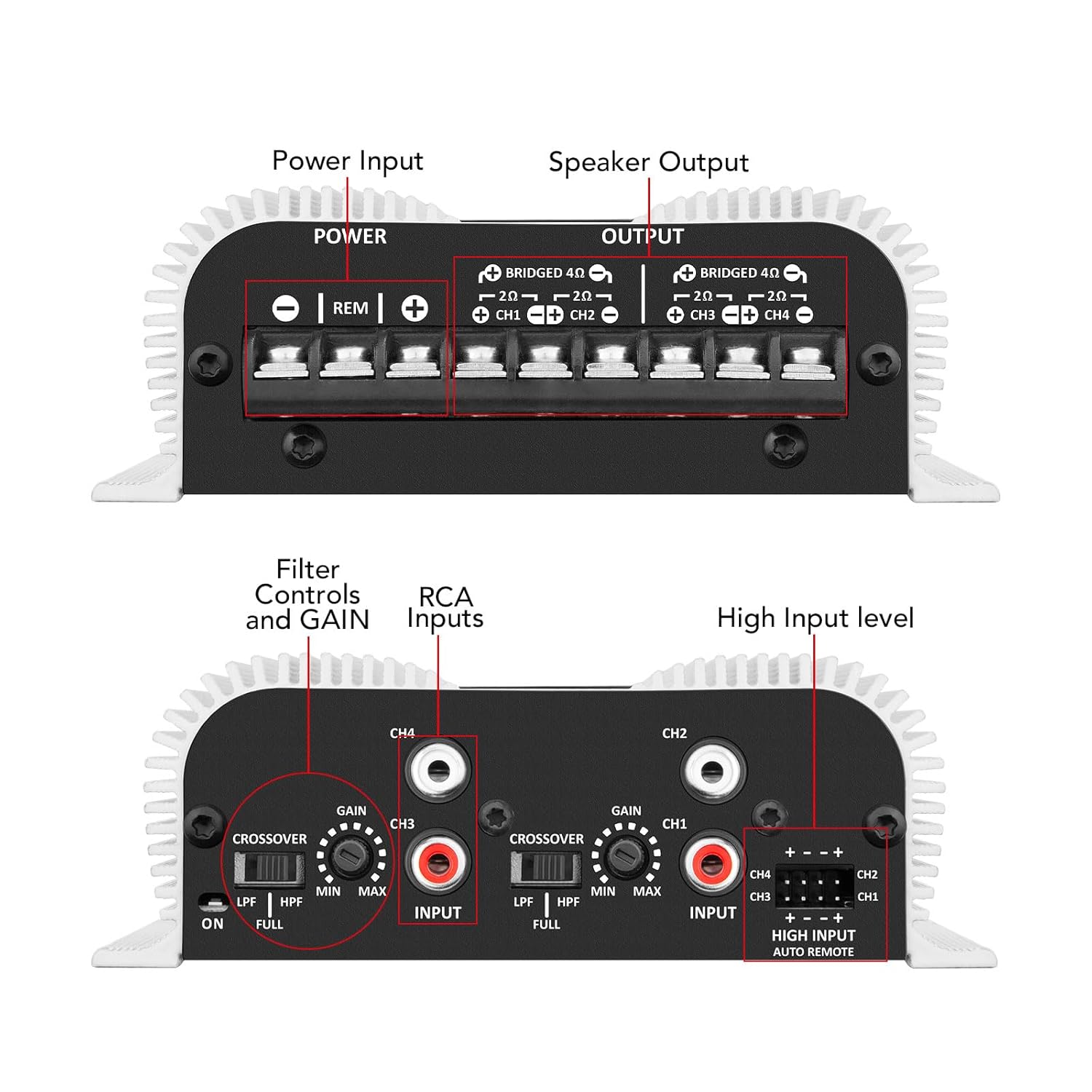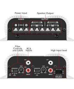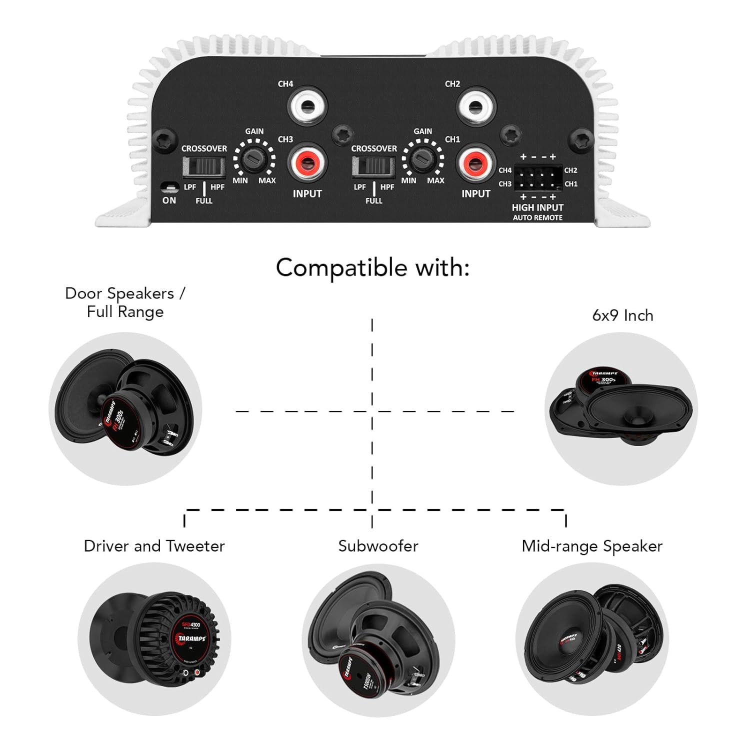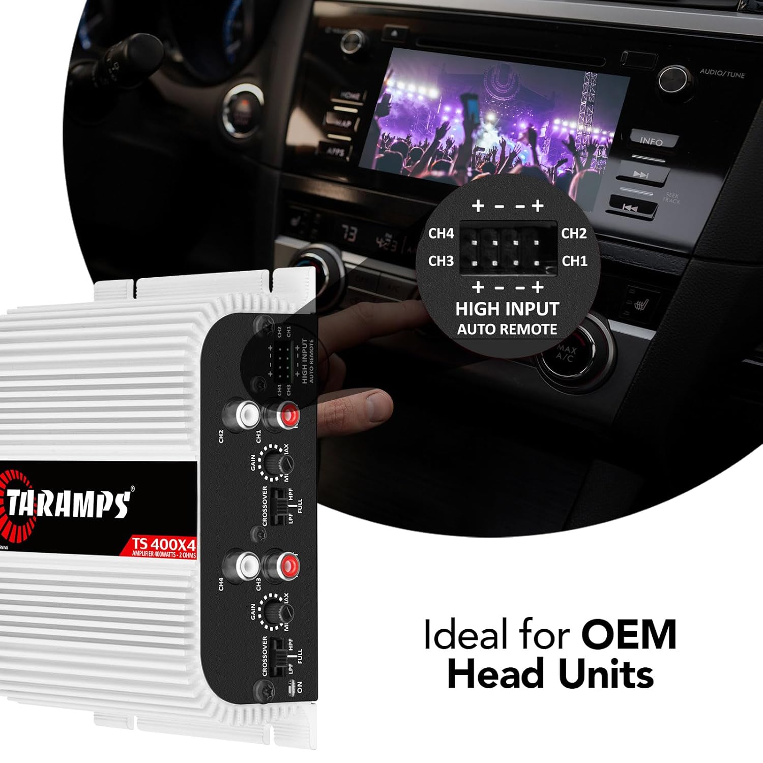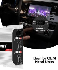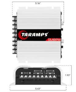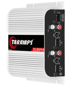 Taramps TS 400×4 2 Ohms White Multichannel Stereo Amplifier 400 Watts Rms, 4 Channels, Full Range, Car Audio Digital 2 Bridged Channel, Crossover High/Low Pass, with RCA and Automatic High Level Input